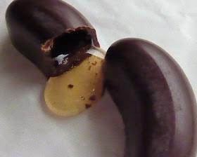 Because again, these chocolates are actually filled with real brandy. And it tastes like brandy, but thicker and much sweeter. The brandy filling almost has the consistency of maple syrup or honey. Somehow, it works with the chocolate. The packaging doesn't specify that it's "dark chocolate," but it certainly seems darker than your average milk chocolate to me. The moderate bitterness of the chocolate helps offset the sticky sweetness of the liquid center. It's a nice combo, and one that I've never had before.